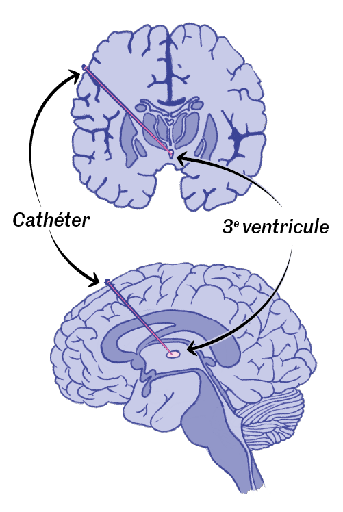 Le système envoie,à l’aide d’un cathéter,de la dopamine dans le troisième ventricule (petite poche de liquide proche du striatum) afin de réduire les blocages,les raideurs mais aussi les mouvements involontaires liés à la maladie. Le manque de cette substance neurotransmettrice dans le cerveau limite en effet la régulation automatique des mouvements et de la pensée.