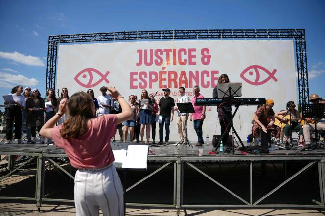 Sur la scène,des musiciens et des choristes transforment cette manifestation en un temps de louanges et de prières à grand renfort de refrains repris par l’assistance. « C’est une journée positive et joyeuse,nous voulons aller contre les logiques de division »,explique Gabriel Amieux,membre de l’équipe organisatrice.