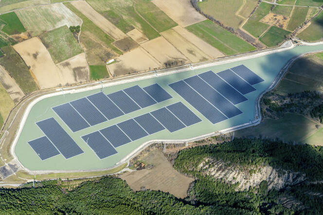Vue aérienne de la centrale solaire flottante de Lazer (Hautes-Alpes),d’EDF Renouvelbales. IMAGEBROKER/HOLGER WEITZEL/MAXPPP Voilà près d’un an que des panneaux solaires flottent sur les eaux bleues du barrage hydroélectrique de Lazer,dans les Hautes-Alpes. En juin 2023,EDF Renouvelables inaugurait,sur le site alpin,la première centrale photovoltaïque installée sur le plan d’eau d’une centrale hydroélectrique. Equipée de 50 000 panneaux,elle affiche une capacité installée de 20 mégawatts annuels,soit le double de celle de la centrale hydroélectrique.