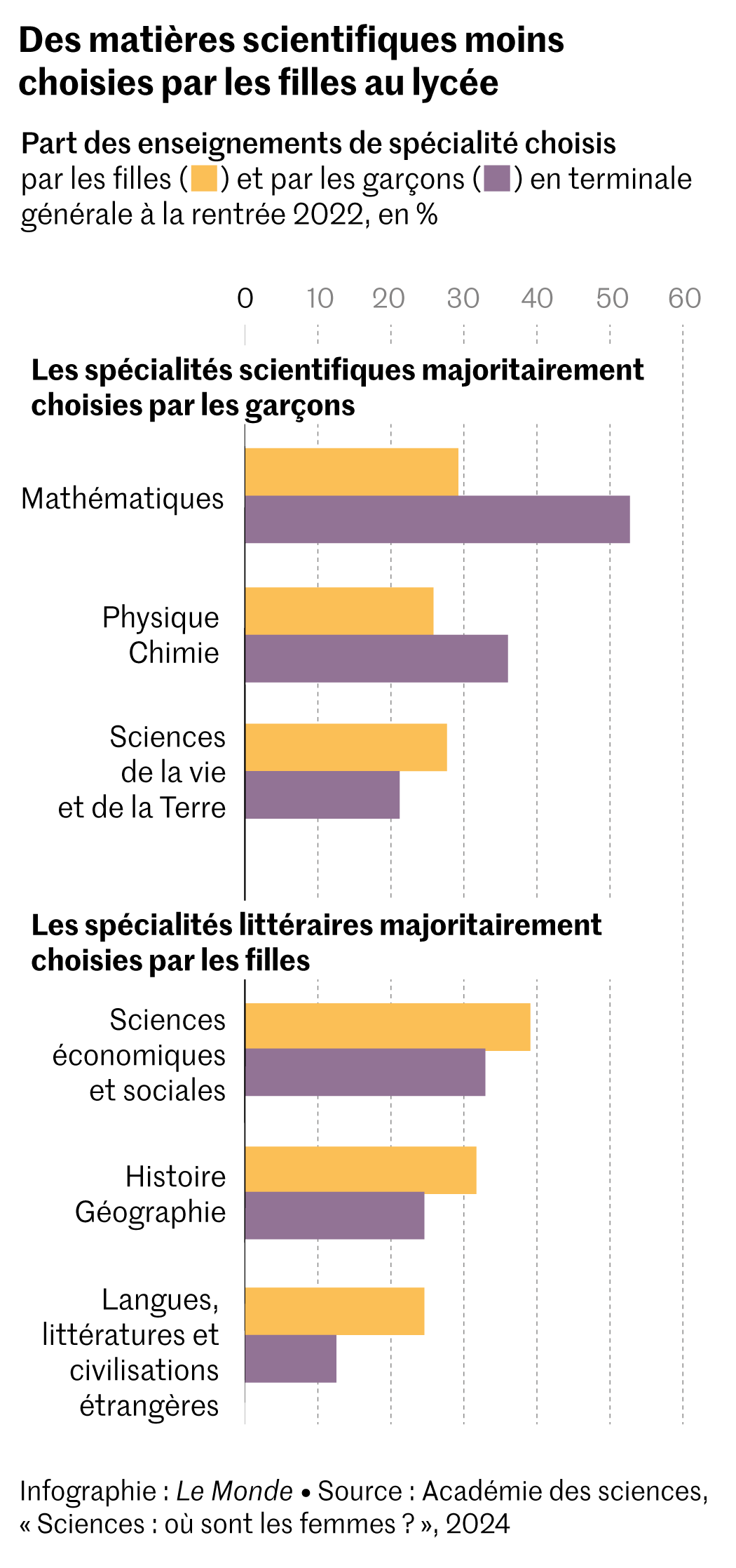 Il n’est guère étonnant dans ces conditions de voir à quel point les choix de spécialités en classes de 1re et de terminale sont genrés. Ce phénomène se serait aggravé à l’occasion de la réforme du lycée de 2019. « En 2022,49 % des filles de terminale générale n’ont choisi aucun enseignement de spécialité scientifique parmi les deux choix possibles[les élèves choisissent trois spécialités en 1re et en gardent deux en terminale],contre seulement 28 % des garçons »,note le rapport de l’Académie des sciences. Le collectif Maths et sciences,qui réunit des associations d’enseignants et de chercheurs,évoque,dans une note elle aussi publiée le 18 juin,une « aggravation inédite des inégalités liées au genre ».