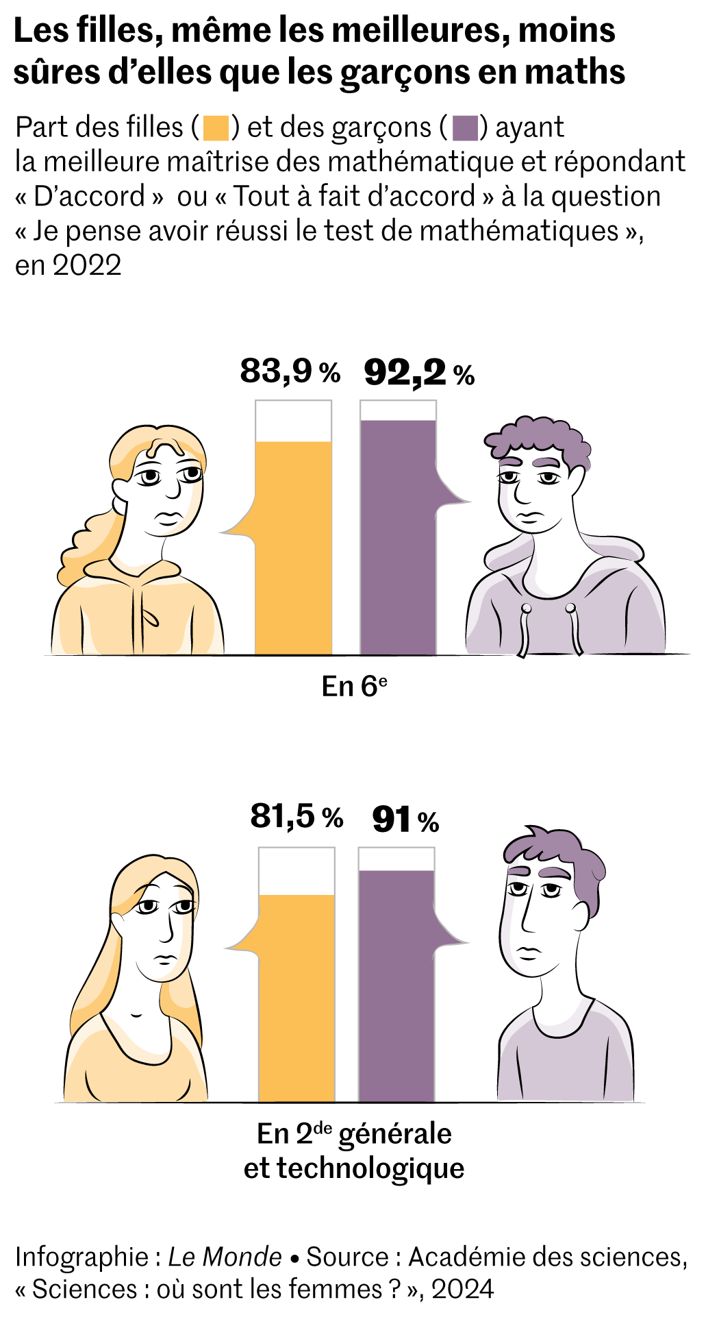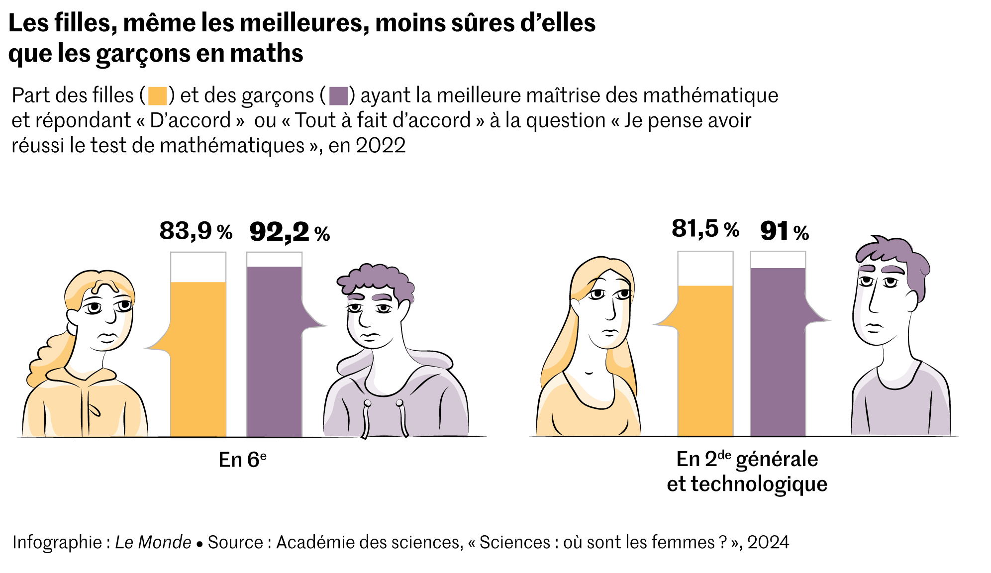 En classe de 6e,si 60,2 % des filles disent être « d’accord » ou « tout à fait d’accord » avec la proposition « je pense avoir réussi le test de mathématiques »,elles ne sont plus que 48,5 % à dire de même en classe de 2de générale et technologique. Surtout,l’écart avec les garçons se creuse. Ce sentiment de réussite des filles,de 16 points inférieur à celui des garçons à l’entrée au collège,se retrouve 19 points en dessous en classe de 2de.