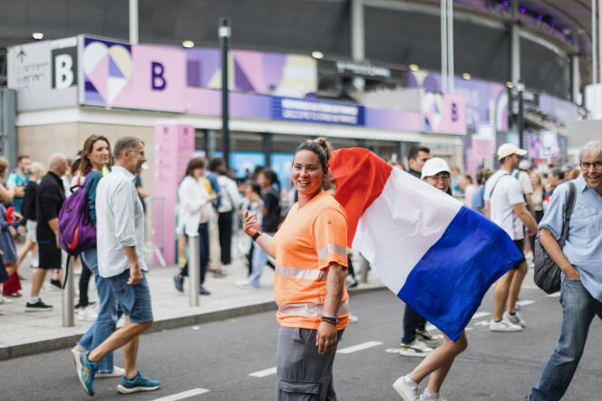 Janie Delmas,34 ans,agente de propreté polyvalente à la Plaine,devant le Stade de France,à Saint-Denis (Seine-Saint-Denis),le 7 août 2024. LAURENCE GEAI / MYOP POUR « LE MONDE » Aux alentours du Stade de France,la vague de spectateurs venue assister aux compétitions de rugby lors de la première semaine des Jeux olympiques (JO) a laissé dans son sillage des canettes et mouchoirs éparpillés sur le sol. « Ça reste une foule,ça arrive de faire tomber des choses. Nous,on ramasse derrière »,souligne Janie Delmas. L’agente de propreté est de celles et ceux mobilisés en renfort aux abords des sites olympiques à Saint-Denis (Seine-Saint-Denis),notamment au niveau de la passerelle du Millénaire ou encore du Franchissement urbainPleyel,ce nouveau pont qui relie le quartier du stade à La Plaine-Saint-Denis,très emprunté par les supporteurs arrivant en transports en commun.