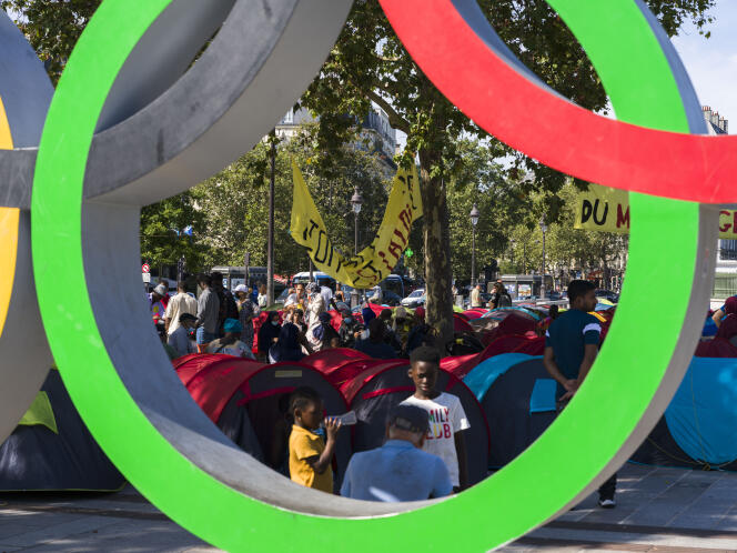 Un campement de tentes,soutenu par les associations Utopia 56 et Droit au logement,sur la place de la Bastille,à Paris,le 6 août 2024. TERENCE BIKOUMOU POUR « LE MONDE » A quelques minutes de marche de l’éphémère parc des Nations,lieu emblématique de célébration des Jeux olympiques (JO),une file d’attente qui n’a,elle,rien de temporaire,s’allonge,avenue de la Porte-de-La-Villette,dans le 19e arrondissement parisien. Mercredi 7 août,plusieurs centaines de personnes en situation de très grande précarité attendent un repas chaud.