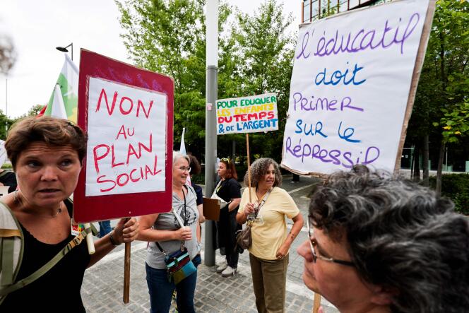 Des salariées de la Protection judiciaire de la jeunesse lors d’un rassemblement à Paris,le 14 août 2024. STEPHANE DE SAKUTIN / AFP Pour protester contre « une casse sociale sans précédent »,l’intersyndicale de la Protection judiciaire de la jeunesse (PJJ),l’instance du ministère de la justice chargée d’accompagner les mineurs délinquants,mais aussi de protéger les mineurs en danger,avait appelé à la grève,mercredi 14 août.