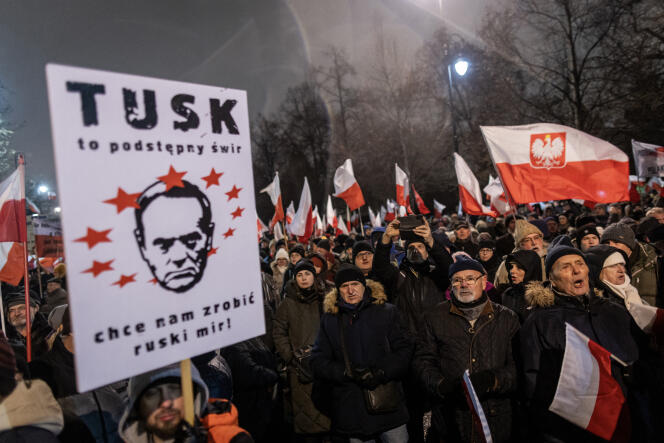Des partisans du parti Droit et justice (PiS) protestent contre la restructuration des médias publics lancée par le gouvernement,à Varsovie,le 11 janvier 2024. Sur la banderole,on peut lire : « Tusk est un monstre sournois. Il veut nous donner la paix russe. » WOJTEK RADWANSKI / AFP Avec ses petites lunettes rectangulaires et son costume de couleur bleu marine,Ernest Zozun semble être dans son élément sur le plateau de la télévision publique polonaise TVP Info,où il coanime une émission d’actualité internationale depuis janvier. Cet ancien correspondant de la radio publique polonaise en Russie et en Irak sort pourtant d’une véritable traversée du désert. En 2020,après plus de trente ans au sein des médias publics,ce journaliste avait été remercié de l’iconique radio publique Trojka,après avoir dénoncé la censure d’une chanson critiquant le pouvoir national-conservateur de l’époque.