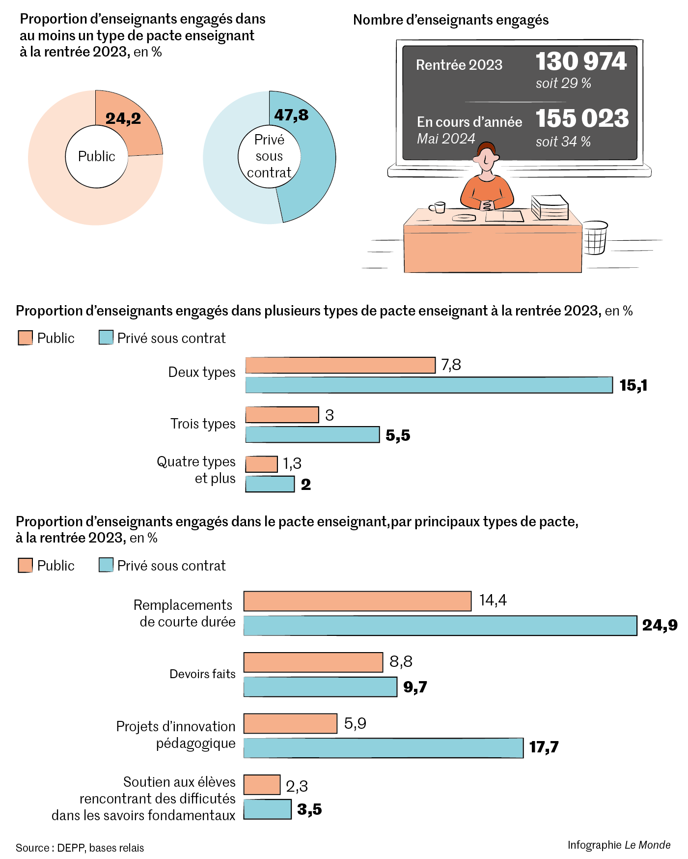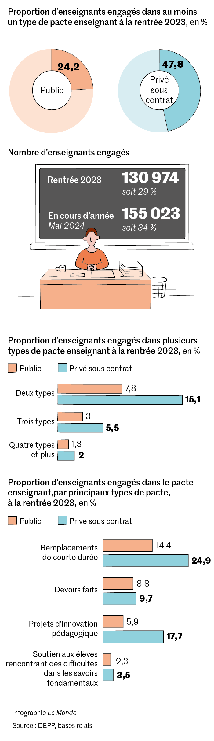 Contacté,le ministère fait valoir que cette publication ne concerne pas le premier degré ni les personnels non enseignant et ne permet donc pas « de dresser un bilan du pacte » et « n’est pas représentative de la répartition public/privé des enseignants » – qu’il ne précise toutefois pas.