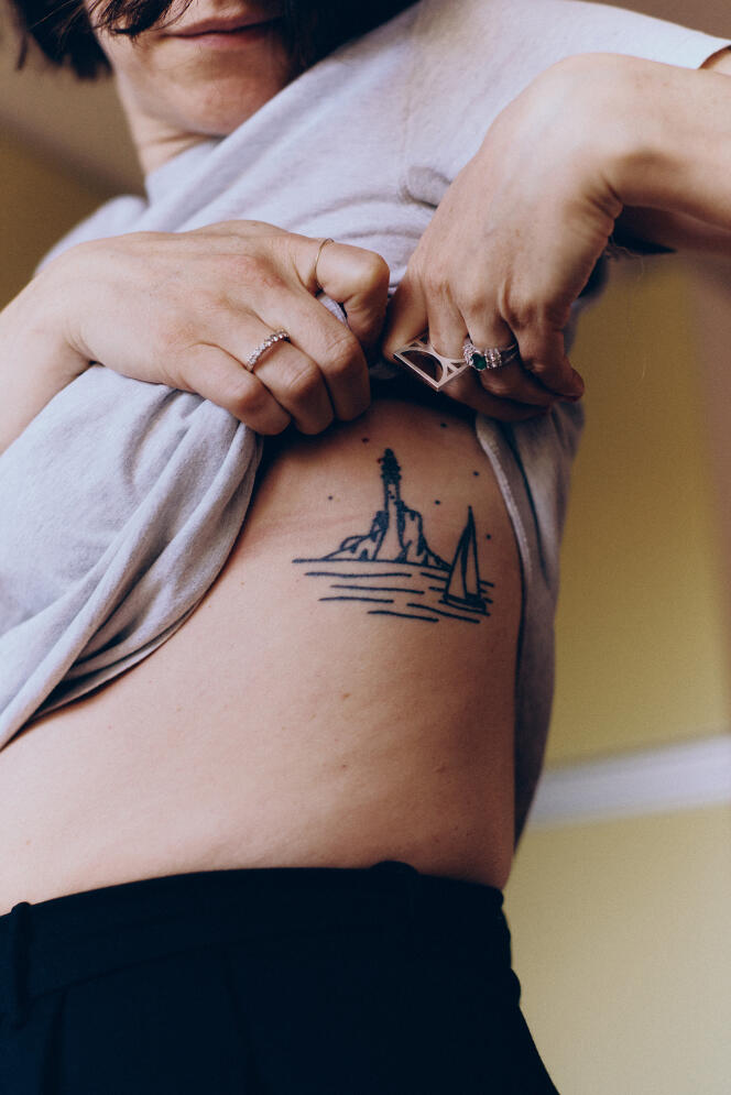 Je suis passée la première. Pour ne pas penser à la douleur,je me rappelle avoir compté le nombre de carreaux du revêtement au sol dans le studio de tatouage. Ensuite,ç’a été le tour de mon frère,qui a gémi toute la séance. Lui l’a fait sous les côtes,un endroit très sensible. Moi légèrement plus sur le côté,car je savais que je voulais avoir un deuxième enfant et qu’il ne fallait pas choisir un endroit où la peau puisse être distendue par la grossesse.