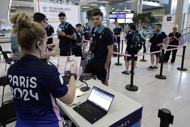 Accueil de l’équipe de volley-ball d’Argentine à l’aéroport de Paris-Charles-de-Gaulle,le 23 juillet 2024. STEPHANE DE SAKUTIN / AFP A leur sortie de la navette qui relie les terminaux de l’aéroport Roissy-Charles-de-Gaulle,les voyageurs n’ont pas eu droit à l’accueil souriant des volontaires tout en vert des Jeux olympiques et paralympiques : à la place,des personnes en chasuble CGT leur distribuant des tracts,sous surveillance policière,et les uniformes bleus des salariés du Comité d’organisation des Jeux olympiques et paralympiques (COJOP).