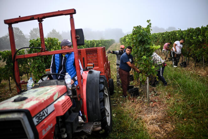 Vendanges à Branne (Gironde),dans l’Entre-deux-Mers,le 28 août 2024. CHRISTOPHE ARCHAMBAULT / AFP En Champagne,les sécateurs ne s’agitent pas encore dans les rangs de vigne quand,dans le vignoble de Fitou,les pressoirs sont déjà à l’arrêt. Une illustration de la diversité des terroirs viticoles français. C’est à ce moment crucial,en plein mitan des vendanges,que le ministère de l’agriculture a publié sa nouvelle prévision de production pour le millésime 2024. Et le tableau s’assombrit. La collecte pourrait être en repli de 18 % sur un an,en dessous de la barre des 40 millions d’hectolitres,à 39,3 millions,selon un communiqué publié vendredi 6 septembre. Le ministère revoit ainsi à la baisse ses premières estimations faites début août où il tablait sur un volume compris entre 41 et 43 millions.