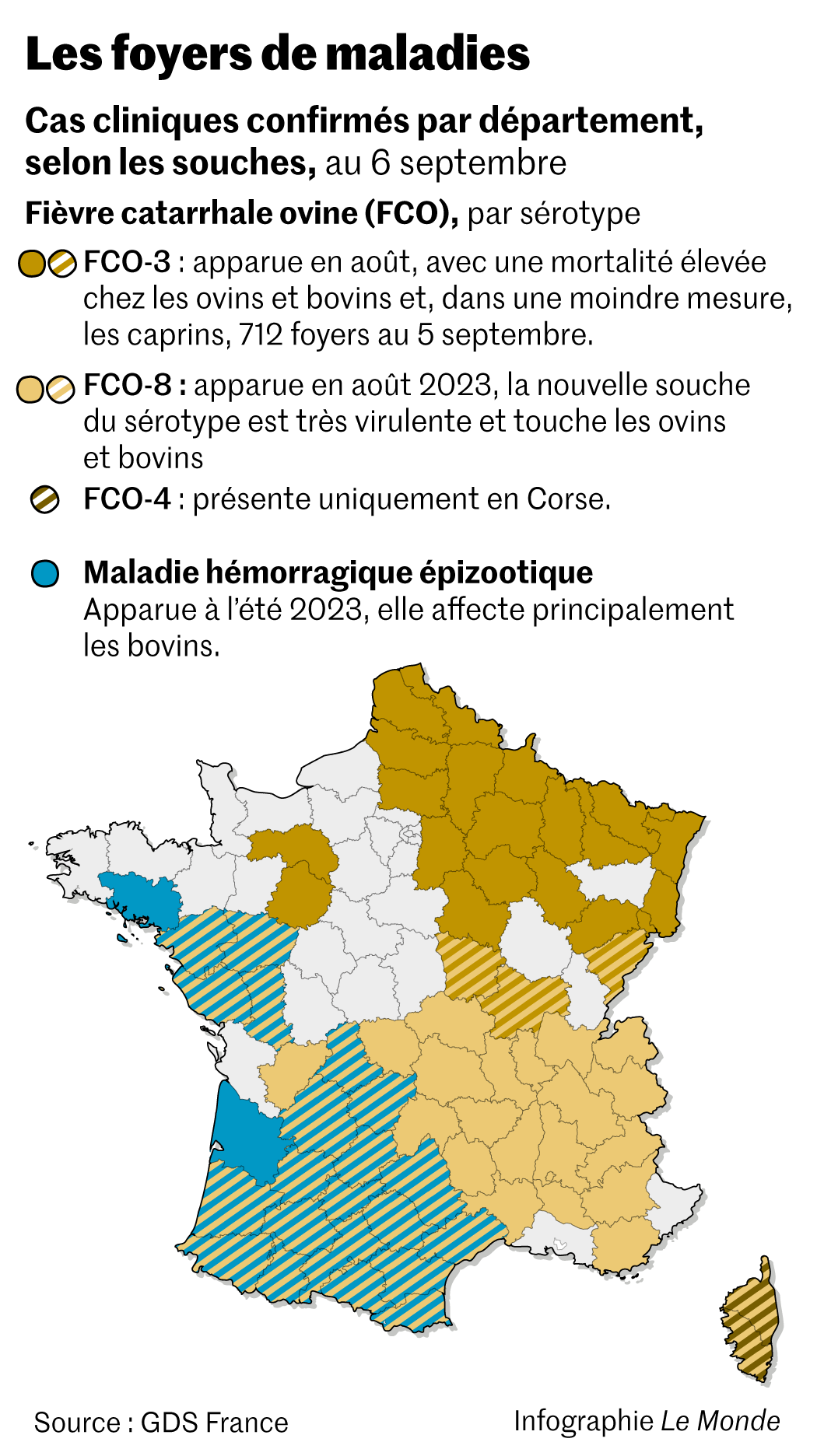 « La situation française actuelle est inédite en Europe,donc ça nous inquiète »,s’alarme Emmanuel Garin,vétérinaire épidémiologiste pour le réseau des Groupements de défense sanitaire (GDS France). « Pour un élevage,être touché par une maladie,ça a des impacts sur la santé et le bien-être des bêtes,sur la production,sur le coût des traitements vétérinaires. Mais si en plus,quelques mois après,c’est au tour d’une deuxième puis d’une troisième maladie,on ne sait pas ce que ça va avoir comme conséquence ; c’est une grande inconnue »,explique l’expert,qui conseille les éleveurs pour améliorer la santé et le bien-être de leurs animaux.
