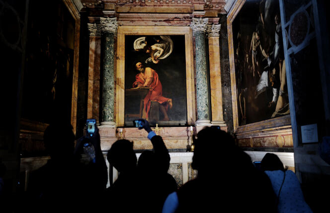 « Saint-Matthieu et l’Ange »,peinture du Caravage (vers 1602),dans l’église Saint-Louis-des-Français à Rome,le 24 octobre 2022. ALAIN GUILHOT Les visiteurs en seront pour leurs frais : l’église Saint-Louis-des-Français,à Rome,est en travaux,et la plupart de ses trésors ne sont pas visibles. Pour l’heure,seule la nef est accessible. Les deux bas-côtés ainsi que les dix chapelles latérales sont masqués au public par des bâches et des échafaudages,dissimulant notamment l’inestimable Cycle de Saint-Matthieu,du Caravage,devant lequel des centaines de milliers de curieux s’extasient chaque année. Décidés il y a quelques mois,les travaux doivent se terminer début décembre. Leur objectif : refaire l’ensemble de l’installation électrique hors d’âge ainsi que les éclairages de l’église,tout en mettant l’ensemble à l’abri des risques d’incendie.