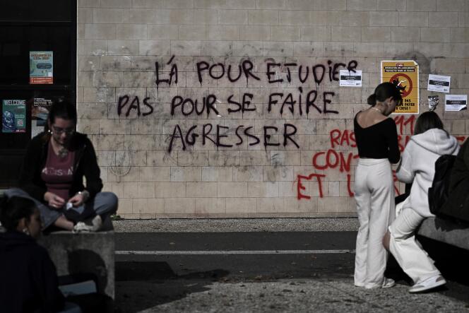 A l’université Bordeaux-Montaigne,après des révélations de plusieurs cas présumés de comportements inappropriés,y compris des violences sexistes et sexuelles,à Pessac (Gironde),le 15 novembre 2023. PHILIPPE LOPEZ / AFP Les « rites étudiants » sont trop souvent le paravent d’abus inacceptables,rapporte une enquête de l’Observatoire des violences sexistes et sexuelles dans l’enseignement supérieur,publiée le 16 septembre. Sur la base des témoignages de près de 4 000 étudiants ayant intégré un établissement entre 2022 et 2024,l’étude établit qu’un tiers d’entre eux a été victime ou témoin d’au moins une violence sexiste ou sexuelle lors d’un week-end,une soirée festive ou d’un événement sportif d’intégration. A peine 5 % des témoins ou victimes ont signalé les faits à leur établissement par la suite.