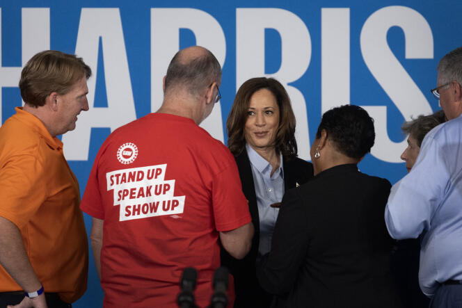 La vice-présidente Kamala Harris,candidate démocrate à la présidentielle,salue des dirigeants syndicaux lors d’un rassemblement de campagne à la Northwestern High School de Detroit,dans le Michigan,le 2 septembre 2024. SCOTT OLSON / GETTY IMAGES VIA AFP C’est un camouflet pour la candidate démocrate à l’élection présidentielle de novembre,Kamala Harris. Le syndicat des Teamsters,les routiers américains,a décidé de ne pas la soutenir à l’élection présidentielle. Une première pour une organisation qui appelait à voter systématiquement pour les candidats démocrates depuis l’an 2000. Ce syndicat est connu du grand public pour son président de légende,Jimmy Hoffa,lié à la Mafia et disparu en 1975 sans doute assassiné. Il va surtout peser de ses 1,3 million de membres dans l’élection.