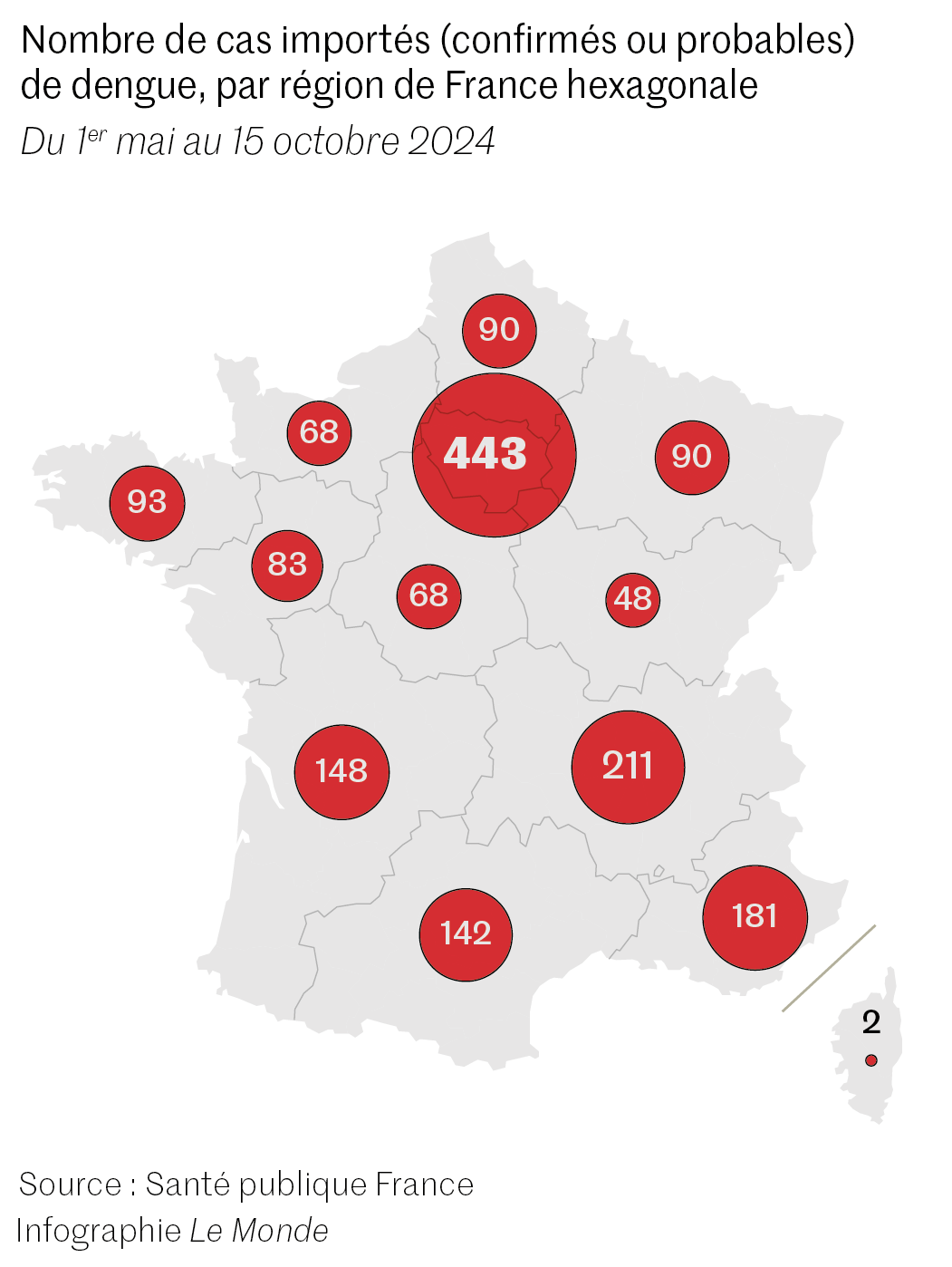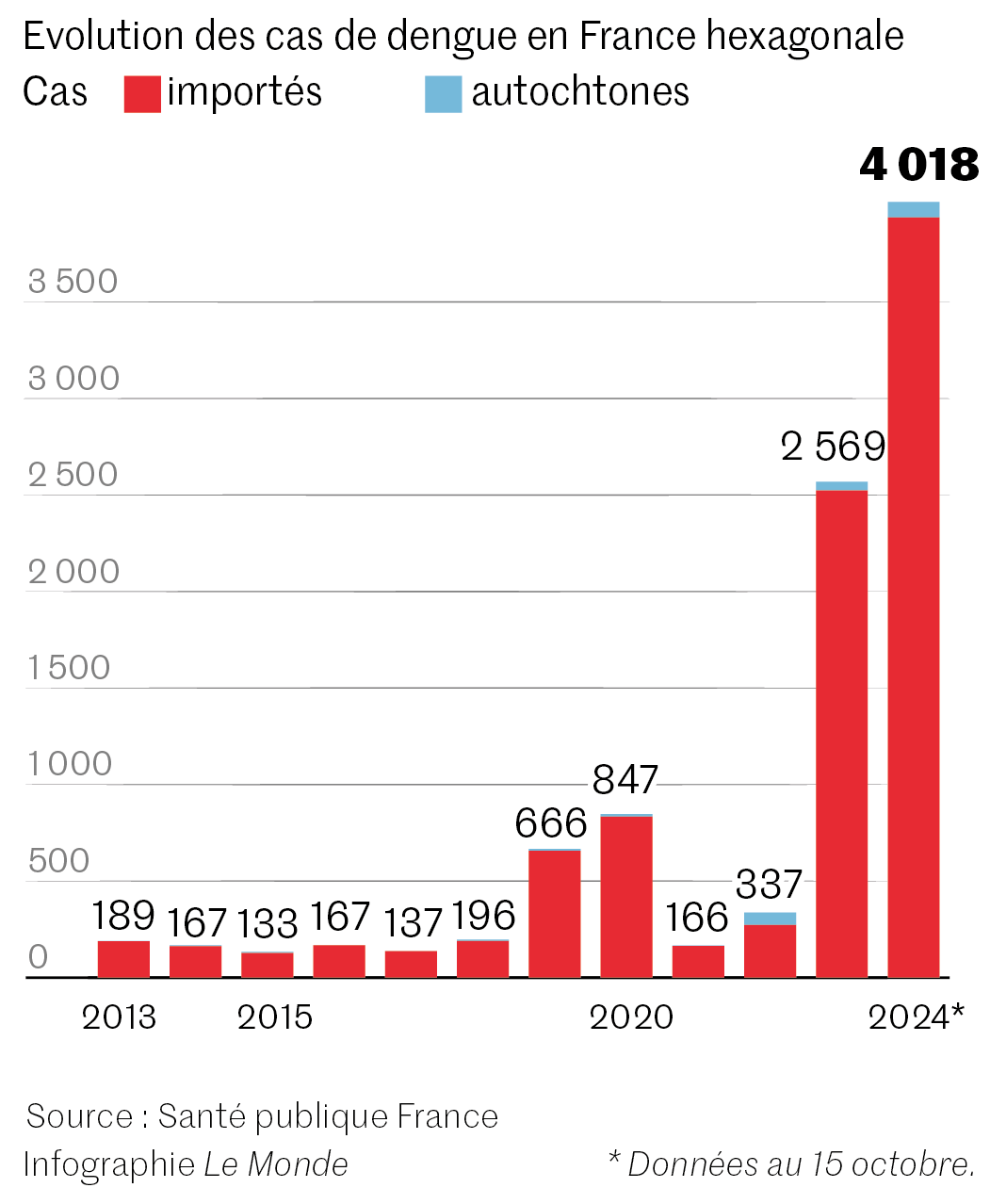 S’il ne s’agit pas encore d’une épidémie,c’est un record,puisque le plus grand nombre de cas autochtones (66) avait jusque-là été observé en 2023 sur toute la saison des moustiques,du 1er mai au 30 novembre. « Il est encore possible d’arriver à une centaine de cas cette année »,estime Frédéric Simard,directeur de recherche à l’Institut de recherche pour le développement (IRD) à Montpellier. « De gros foyers de contamination peuvent encore arriver en fin de saison,même si l’on est sur la phase descendante de la contamination »,avertit l’entomologiste médical.
