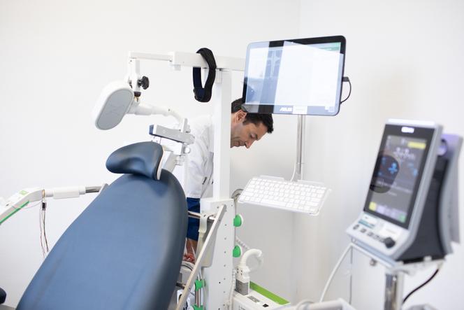 Florian Ferreri,psychiatre et coresponsable du centre de référence psychotrauma Paris-Centre-Sud,installe les appareils de stimulation transcrânienne pour traiter le stress post-traumatique. A l’hôpital Saint-Antoine (AP-HP),à Paris,le 18 octobre 2024. JULIE BALAGUÉ POUR « LE MONDE » Ce matin d’octobre,dans une petite pièce du service de psychiatrie de l’hôpital Saint-Antoine (AP-HP),Julien – le prénom a été modifié – est installé dans un fauteuil,avec,sur la tête,une sorte de bonnet vert en néoprène. Délicatement,le psychiatre Alexis Bourla déplace un bras robotisé pour bien positionner une bobine électromagnétique sur son cuir chevelu,afin de délivrer des impulsions magnétiques dans la zone cérébrale cible : le cortex préfrontal dorsolatéral droit. Cette zone est impliquée notamment dans la gestion de la mémoire,de la prise de décision,dans le contrôle des impulsions et des émotions,dont le circuit de la peur.