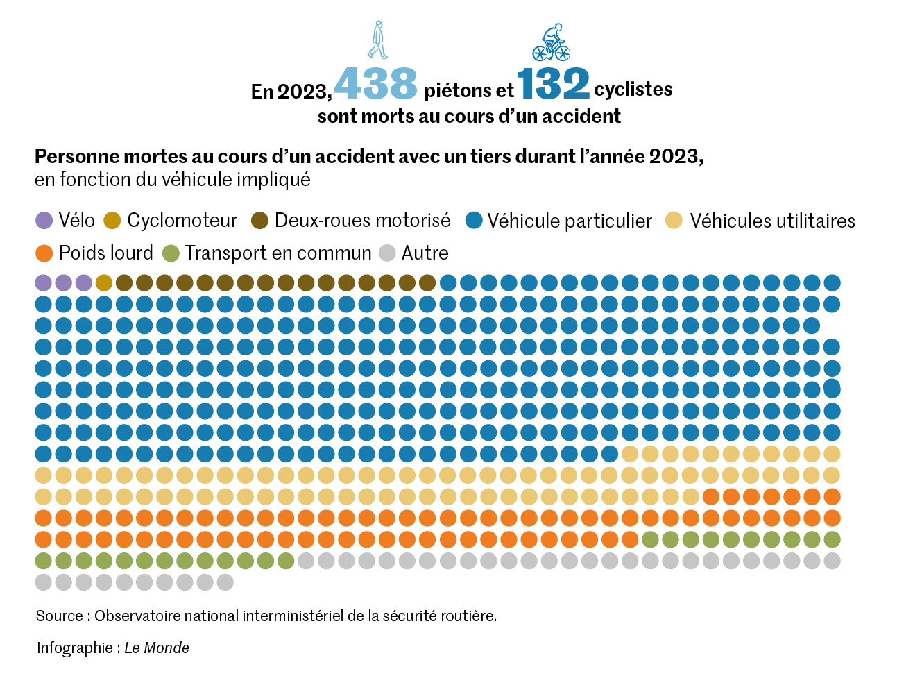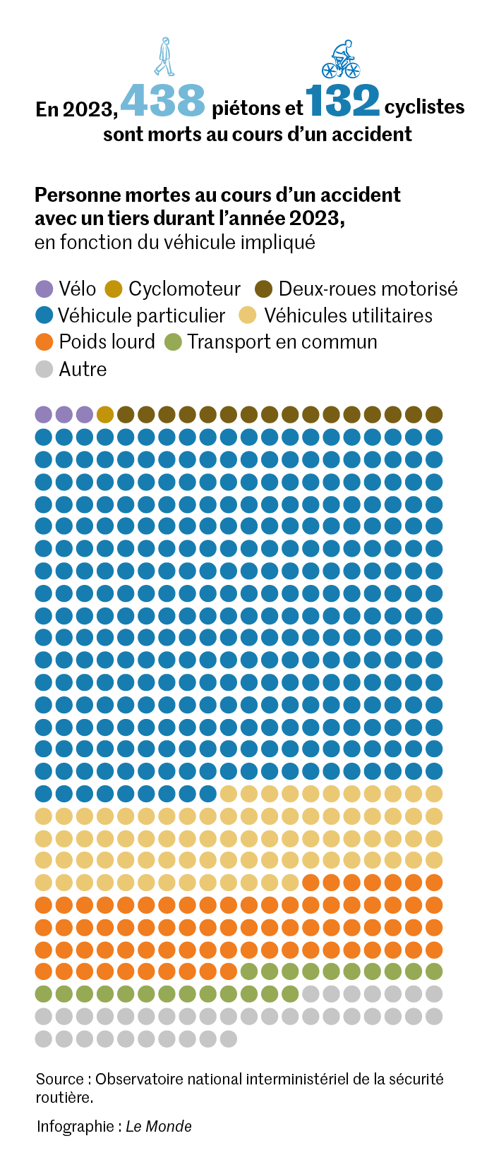 « En 2023,221 cyclistes ont été tués,décomptait l’Observatoire national interministériel de la sécurité routière,(…) en augmentation de + 18 % par rapport à 2019. » Parmi les piétons,on dénombre 438 morts au cours d’un accident avec un tiers en 2023,en diminution de 10 % par rapport à 2019. Et lorsque piétons ou cyclistes meurent dans un accident avec un tiers,dans 72 % des cas,ce tiers conduit une voiture ou un véhicule utilitaire.