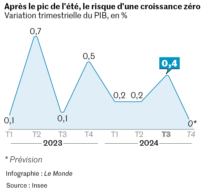 Le ministre de l’économie,des finances et de l’industrie,Antoine Armand,et le premier ministre,Michel Barnier,au palais de l’Elysée,à Paris,le 15 octobre 2024. JULIEN MUGUET POUR « LE MONDE » L’héritage des Jeux olympiques et paralympiques (JOP) ne se retrouvera pas que dans les équipements sportifs ou les aménagements urbains mais aussi dans les chiffres de la croissance. Les JOP auront permis à l’économie française de réaliser sa meilleure saison de l’année,avec une hausse du produit intérieur brut (PIB) de 0,4 %,selon la première estimation, conforme aux prévisions publiées par l’Insee mercredi 30 octobre. Au premier comme au deuxième trimestre,la progression avait été de 0,2 %. Tout compte fait,l’économie française devrait boucler 2024 sur une croissance modeste de 1,1 %,en ligne avec les hypothèses budgétaires. L’Insee s’attend en effet à ce que les trois derniers mois de l’année soient atones.