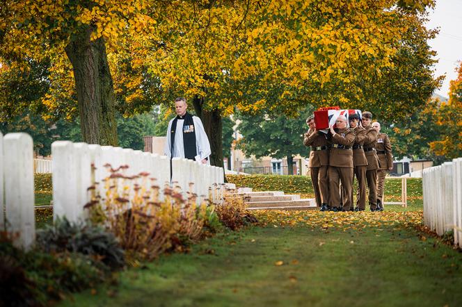 Inhumation de cinq soldats inconnus écossais dont les corps ont été retrouvés récemment,au cimetière militaire britannique de Loos-en-Gohelle (Pas-de-Calais),le 15 octobre 2024. CWGC La sonnerie aux morts vient de retentir. Sous un soleil voilé en ce jour d’octobre,on devine les silhouettes d’un régiment écossais avançant dans le cimetière militaire. Nous sommes à Loos-en-Gohelle,près de Lens,dans l’ancien bassin minier du Pas-de-Calais. La mine grave et tête nue dans leurs uniformes marron,ces soldats portent un cercueil enveloppé d’un drapeau britannique sur lequel repose une couronne de coquelicots rouge sang. Ils se dirigent à pas lents vers le trou creusé dans la terre où ce soldat inconnu va être inhumé,comme quatre autres,avec les honneurs militaires. Des collégiens de Loos-en-Gohelle assistent à la cérémonie,réglée au millimètre,avec des passionnés de la guerre 14-18 et quelques élus de la ville,théâtre de trois grandes batailles entre mai 1915 et août 1917,au cours desquelles elle fut entièrement rasée.