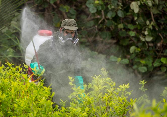 Un policier colombien vaporise du glyphosate sur des champs de coca,à Tumaco,en 2020. JUAN BARRETO / AFP