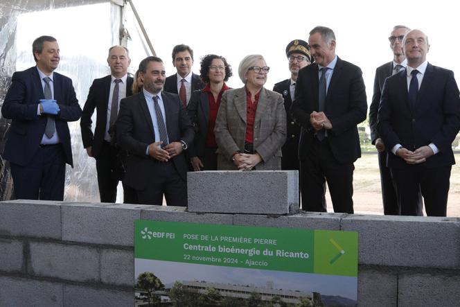 La ministre française du partenariat avec les territoires,Catherine Vautrin (au centre),s’entretient avec le président du conseil exécutif de Corse,Gilles Simeoni (3e en partant de la droite),sous le regard du PDG d’EDF,Luc Rémont (à gauche),et du maire d’Ajaccio,Stéphane Sbraggia (3e en partant de la gauche),lors de la pose de la première pierre de la centrale à la biomasse du Ricanto,à Ajaccio (Corse),le 22 novembre 2024. PASCAL POCHARD-CASABIANCA / AFP En cimentant d’une main leste un parpaing sur un muret,vendredi 22 novembre,Luc Rémont n’a pas seulement lancé le chantier de construction de la centrale du Ricanto,à Ajaccio. Le président-directeur général d’EDF a aussi mis fin à des années d’errance énergétique dans une microrégion où la dernière centrale thermique à fioul lourd de France métropolitaine,celle du Vazzio,est en activité depuis 1982.