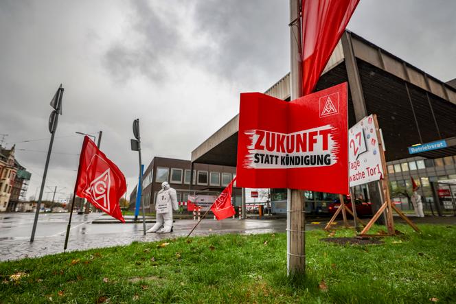 Devant l’entrée du site de Thyssenkrupp Steel Europe à Duisbourg (Rhénanie-du-Nord-Westphalie),le 25 novembre 2024. CHRISTOPH REICHWEIN / DPA PICTURE-ALLIANCE VIA AFP La série noire continue dans l’industrie allemande. Lundi 25 novembre,la branche sidérurgique de ThyssenKrupp a annoncé la suppression de 11 000 emplois d’ici à 2030,sur les 27 000 que compte l’aciériste de la Ruhr,emblématique de la sidérurgie allemande depuis ses origines. Ce plan social majeur intervient dans un contexte de grande vague de destructions d’emplois industriels outre-Rhin,qui touche particulièrement l’automobile,spécialité centrale du « made in Germany ».