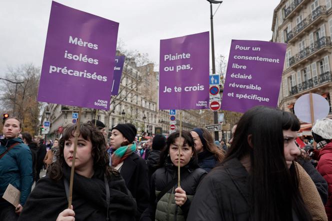 Lors d’une manifestation contre les violences faites aux femmes,à Paris,le samedi 23 novembre 2024. STEPHANE DE SAKUTIN / AFP Le procès des viols de Mazan relance le débat sur l’opportunité de modifier la définition de l’infraction de viol dans le code pénal afin d’y introduire la notion de consentement. Jeudi 28 novembre,une proposition de loi portée par la députée de Paris Sarah Legrain (La France insoumise) est inscrite à l’ordre du jour des débats à l’Assemblée nationale,dans le cadre de la journée d’initiative parlementaire de son groupe.