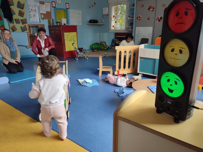 Dans la crèche Rêves et ritournelles à Polignac (Haute-Loire),un sonomètre en forme de feu tricolore a été installé pour prévenir les agents et les enfants lorsque le volume sonore devient trop élevé. La matinée touche à sa fin dans la salle de vie de la crèche Rêves et ritournelles,à Polignac (Haute-Loire). Dans un recoin de la pièce,une auxiliaire de puériculture lit une histoire aux petits. Les grands,eux,profitent des derniers instants de jeu avant le déjeuner. Lila,2 ans et demi,s’amuse,elle aussi,mais décide brusquement d’arrêter ses activités. « Chuuuut ! »,souffle-t-elle,en pointant du doigt un feu tricolore dont la lumière rouge,assortie d’un smiley triste,vient de s’allumer.
