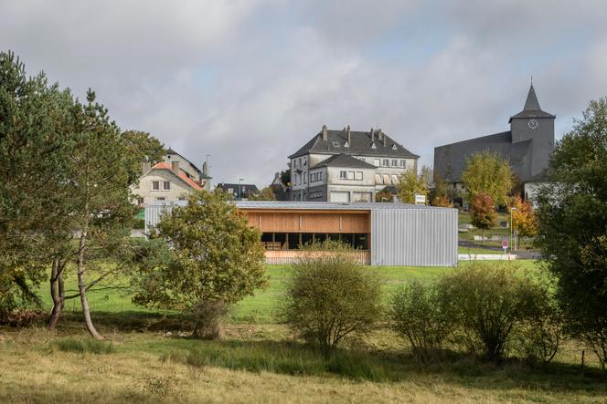 Au premier plan,la salle polyvalente,réalisée par l’Atelier du Rouget,accueille la médiathèque,le centre de loisirs intercommunal et des salles pour les activités (yoga,musique),au Rouget-Pers (Cantal),le 21 octobre 2021. ATELIER DU ROUGET + IGETEC + BIMB Dix heures trente avaient sonné,Annie Delrieu-Tourtoulous’apprêtait à retourner à la mairie,quand,au premier étage d’une vieille bâtisse,un homme en maillot de corps blanc a surgi à la fenêtre : « Hep,Madame ! » Elle est en réunion,répond-elle calmement. Il relance. Il insiste ; elle finit par lâcher. « J’ai entendu dire que,quand la place sera terminée,on ne pourra plus se garer ? J’ai des problèmes de dos,je suis essoufflé,je ne peux pas aller à perpète ! »