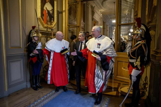 Le ministre de la justice,Gérald Darmanin (au centre),entouré du premier président de la Cour de cassation,Christophe Soulard (à gauche),et du procureur général,Rémy Heitz (à droite),avant l’audience solennelle d’ouverture de la Cour de cassation,au palais de justice historique de Paris,le 10 janvier 2025. ANNE-CHRISTINE POUJOULAT/AFP Une profonde dysharmonie entre ce que l’on voit et ce que l’on entend. Voilà ce que l’on pouvait ressentir,le matin du vendredi 10 janvier,sous les dorures de la Grand’chambre de la Cour de cassation,à l’occasion de sa traditionnelle audience solennelle. Ce rituel protocolaire de début d’année est l’occasion pour les deux plus hauts magistrats de France,Christophe Soulard,le premier président,et Rémy Heitz,le procureur général,de délivrer quelques messages à fort contenu politique,devant les représentants des plus grandes institutions judiciaires (Conseil d’Etat,Conseil constitutionnel… ),mais surtout devant le premier ministre,François Bayrou,et son garde des sceaux,Gérald Darmanin,tous les deux assis au premier rang. Leur discours,d’une demi-heure chacun,a créé un étonnant effet de contraste avec le décorum et le protocole tout en magnificence de la Cour de cassation. Car c’est bien une justice malade et qui « va dans le mur »,pour reprendre l’expression de Rémy Heitz,que les deux magistrats ont pris soin de décrire.
