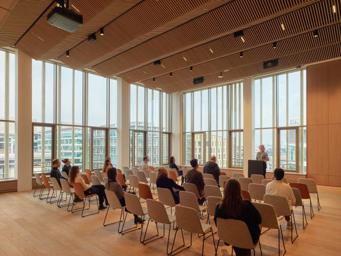 La grande salle du centre John W. Boyer,de l’université de Chicago,à Paris,dans le 13ᵉ arrondissement. FABRICE FOUILLET L’Américaine Jeanne Gang est fière des brise-soleil en pierre qui protègent le nouveau siège de l’antenne française de l’université de Chicago,à Paris.Clin d’œil au vieux Paris et à celui d’Haussmann,ce rideau de colonnes blanchâtres occulte le bois de la façade. Reflétant la structure,elle aussi en bois,du bâtiment,ce dernier était un élément fort du projet. C’est un des paradoxes de ce matériau : érigé en symbole de vertu environnementale,il est considéré sur le plan esthétique avec condescendance.