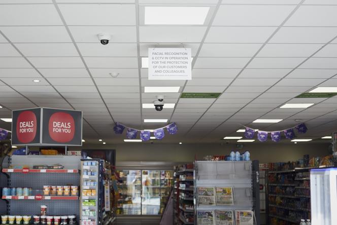 Dans un supermarché qui utilise la technologie de la société Facewatch,un panneau indique que « la vidéosurveillance et la reconnaissance faciale sont utilisées pour la protection des clients et des employés ». A Bristol (Royaume-Uni),le 28 juin 2023. SUZIE HOWELL/NYT-REDUX-REA Sur la vitrine,un panneau prévient : « Reconnaissance faciale en cours. Pour protéger nos employés,nos clients,nos biens. » A l’entrée du magasin Sports Direct,à Stoke Newington,un quartier résidentiel du nord-est de Londres,la boule noire oscillant dans un socle blanc est bien visible. Au Royaume-Uni,un pays dont la capitale abrite la plus forte densité de caméras de surveillance au monde en dehors de la Chine,la reconnaissance faciale se généralise : 97 pour 1 000 habitants contre 2,1 pour 1 000 habitants à Paris,selon les chiffres de la société de sécurité britannique Clarion Security Systems et,pour la France,du ministère de l’intérieur.