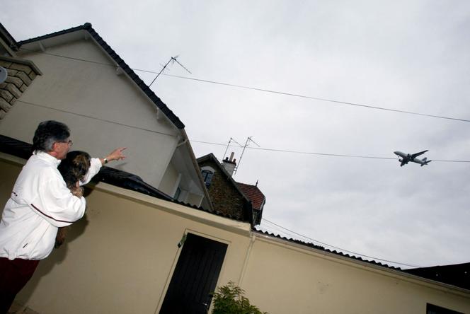 Un avion passant à basse altitude au-dessus de Villeneuve-Le-Roi (Val-de-Marne),une commune voisine de l’aéroport d’Orly,le 12 juillet 2004. JOEL ROBINE / AFP Moins de cinq minutes après être sorti de la gare du RER C de Villeneuve-le-Roi,dans le Val-de-Marne,le bruit se fait entendre. Un vrombissement progressif qui envahit le ciel et occupe tout l’espace sonore pendant de longues secondes : un avion vient de décoller de l’aéroport voisin d’Orly,dont l’une des trois pistes est mitoyenne de la commune,séparée des maisons d’un simple mur de 2 mètres de hauteur.