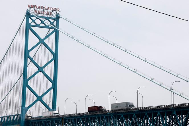 Des camions venant de Windsor,au Canada,traversent le pont Ambassadeur,en direction de Detroit,dans le Michigan (Etats-Unis),le 3 février 2025. JEFF KOWALSKY / AFP A 5 h 01 GMT,6 h 01 en France métropolitaine,mardi 4 février,les droits de douane annoncés par Donald Trump à l’encontre des principaux partenaires commerciaux des Etats-Unis auraient dû entrer en vigueur,conformément aux décrets signés samedi. Des pénalités de 25 % sur les importations en provenance du Mexique et du Canada (sauf énergie) et de 10 % supplémentaires sur celles originaires de Chine étaient programmées.