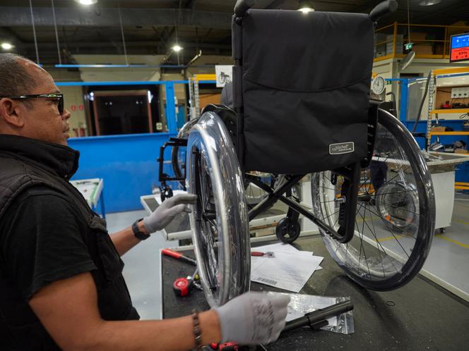 Un employé inspecte un fauteuil roulant à l’usine Invacare de Fondettes (Indre-et-Loire),le 21 juin 2024. GUILLAUME SOUVANT/AFP « Il a un cale-tronc,des accoudoirs,une tablette,une assise,des coussins anti-escarres,une bascule d’assise pour l’incliner en arrière,un appuie-tête. Je peux régler l’inclinaison de mes jambes… » Alexandre Quesque attend avec impatience son futur fauteuil roulant électrique,un Permobil F3 Corpus,qui coûte 28 397,48 euros. « Si mon fauteuil actuel tombe en panne demain,pendant des mois,je suis dans mon lit. C’est vital pour moi »,explique le jeune homme,infirme moteur cérébral.