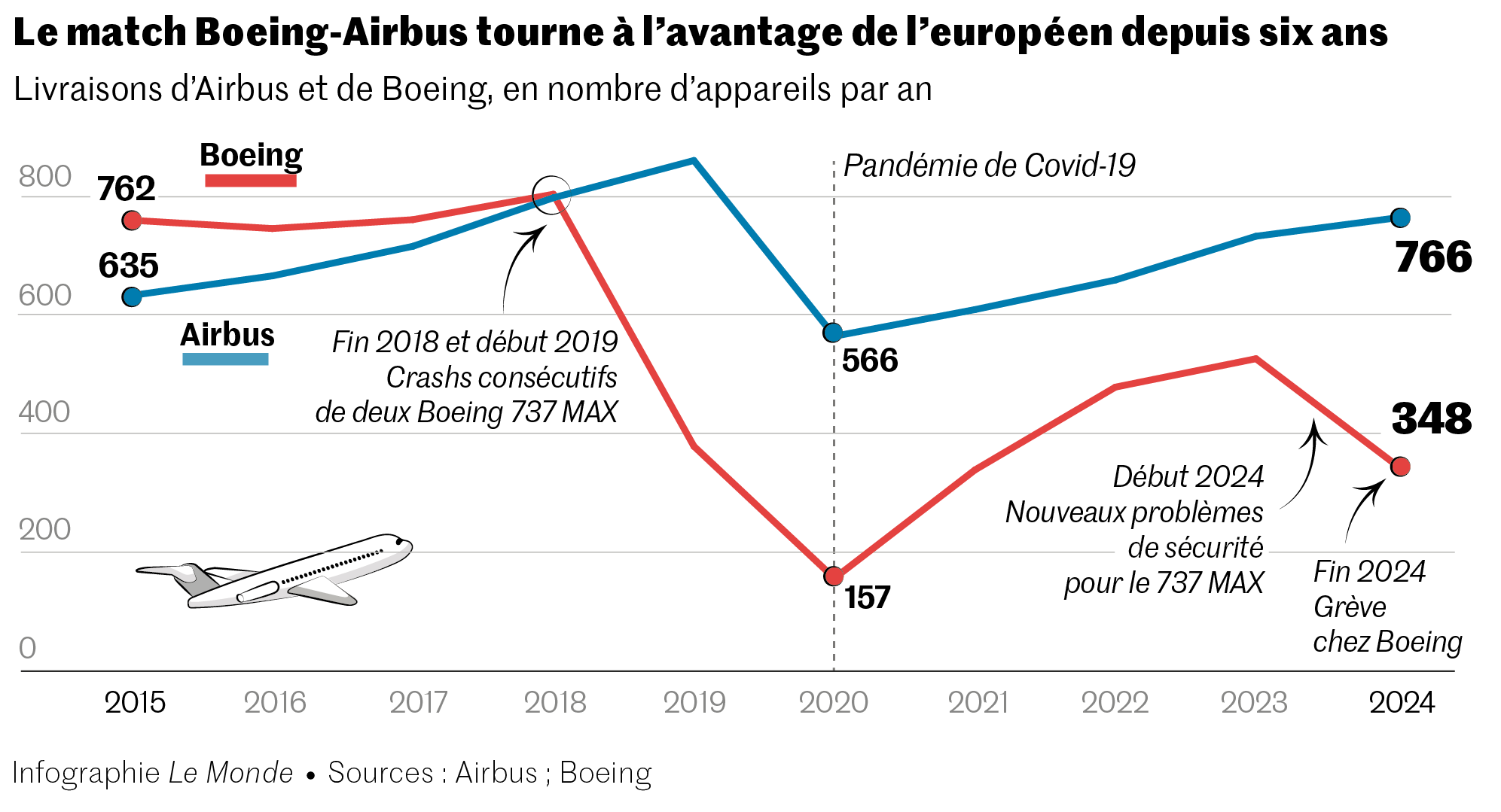En 2024,son bénéfice net a progressé de 12 % pour atteindre 4,232 milliards d’euros et approcher le record de 4,247 milliards d’euros de 2022,à comparer à la perte abyssale de Boeing (–1,4 milliards d’euros,dont presque –8 milliards pour sa seule division aviation commerciale) et à ses 377 commandes engrangées en 2024. Sans surprise,le PDG d’Airbus veut,à l’avenir,surfer sur cette bonne vague.