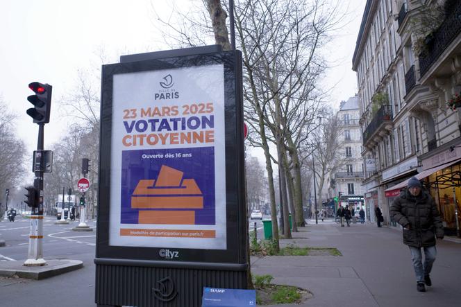 Une affiche pour la votation citoyenne,à Paris,le 7 janvier 2025. BRUNO LEVESQUE/IP3 PRESS/MAXPPP Ce sera la troisième fois que les Parisiens seront invités à voter pour autre chose que des élections. Dimanche 23 mars,la Ville de Paris organise une nouvelle votation – sans doute la dernière de la mandature de la maire,Anne Hidalgo – afin de recueillir l’avis de ses résidents sur la question suivante : pour ou contre végétaliser et rendre piétonnes 500 nouvelles rues dans la capitale ?