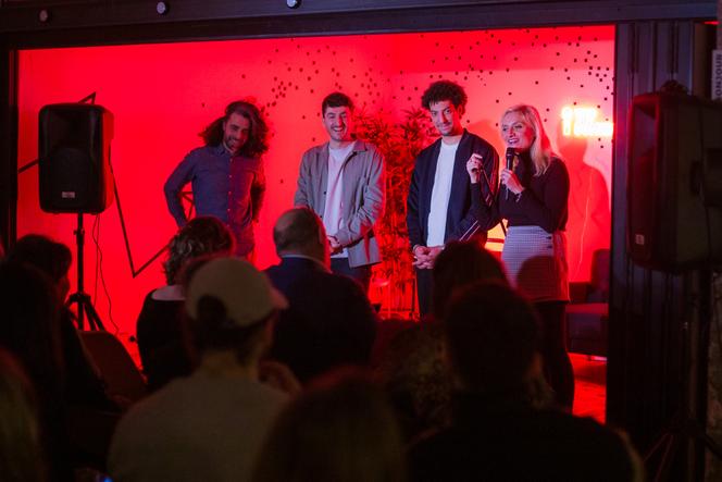 De gauche à droite : Nadim F16,Victor Parnaso,Najim Ziani et Tiphaine Pelliski,du WIP Comedy Club,au Onzième Lieu,le 27 février à Paris. WIP COMEDY CLUB « Qui a passé une bonne journée ? »,lance Tiphaine Pelliski,juriste de tous les jours et humoriste le soir. « Qui a été productif ? Qui est un mytho ? » Après avoir levé la main aux deux premières questions,la salle rit. C’est l’objet du WIP Comedy Club,pour « Work in Progress »,où à chaque session,cinq humoristes se succèdent devant soixante-dix personnes. Douze artistes différents se produiront dans ce cadre au Onzième Lieu,un tiers-lieu parisien,du mardi 18 au jeudi 27 mars.