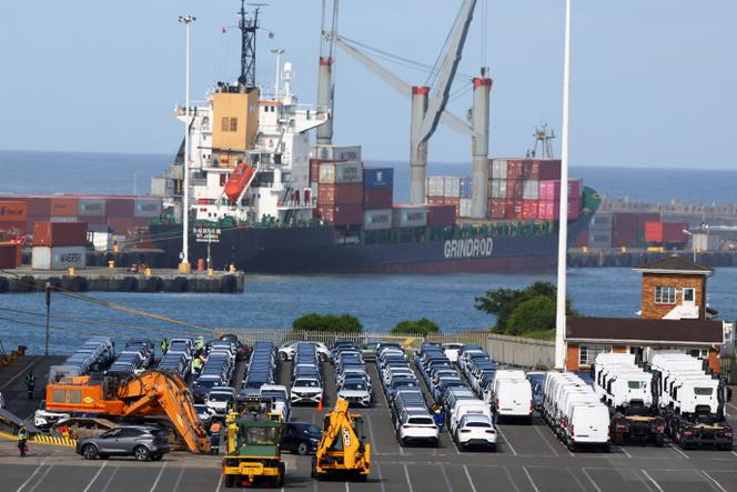 Des voitures fabriquées dans des usines sud-africaines destinées à l’exportation,avant leur chargement sur des navires,dans le port d’East London (province du Cap-Oriental),en Afrique du Sud. SIPHIWE SIBEKO / REUTERS L’Afrique du Sud,sous le feu des critiques de la nouvelle administration américaine,se doutait bien qu’elle ne serait pas épargnée lors de l’annonce de nouveaux tarifs douaniers par Donald Trump,mercredi 2 avril. La sentence ne pouvait toutefois plus mal tomber. En se voyant imposer des droits de douane de 30 %,le pays,dont l’industrie est la première du continent africain,est l’un des plus durement touchés. Ce qui a affaibli encore un peu plus le rand,la monnaie locale,déjà en baisse face au dollar,alors que le gouvernement d’union nationale semble au bord de l’effondrement.
