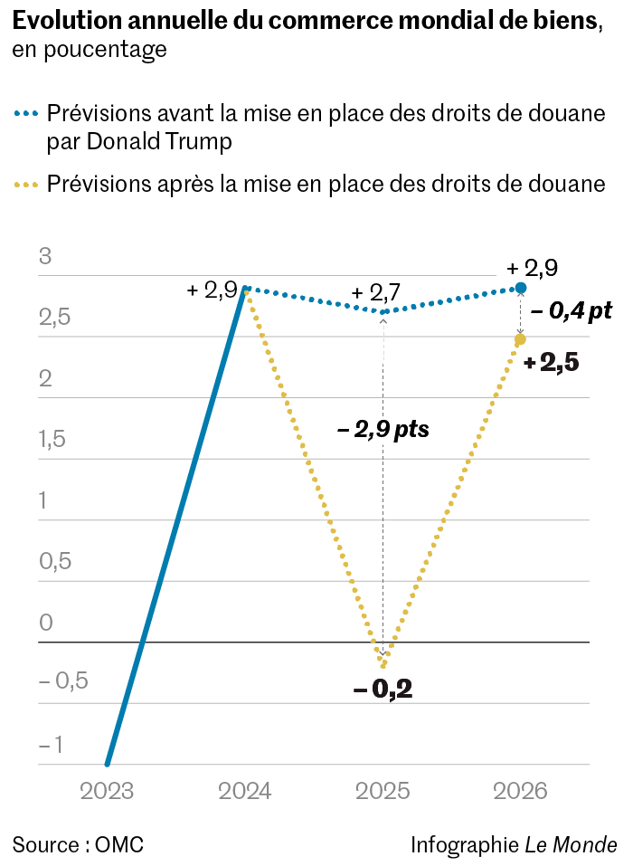 Le choc est d’une telle ampleur qu’il est difficile à mesurer. Dans ses prévisions annuelles publiées ce mercredi 16 avril,l’Organisation mondiale du commerce (OMC) table sur une baisse du volume du commerce mondial de marchandises comprise entre 0,2 % et 1,5 % en 2025 en fonction de la politique douanière de Trump,soit une baisse d’au moins 2,9 points de pourcentage par rapport à ses estimations d’octobre 2024 qui envisageaient une hausse de 2,7 %.