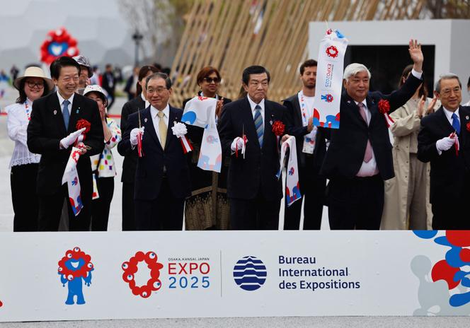 De gauche à droite : le ministre de l’économie,Yoji Muto,le président de l’Association japonaise pour l’exposition universelle de 2025,Masakazu Tokura,le ministre chargé de l’exposition internationale,Yoshitaka Ito,et le ministre de la défense,Gen Nakatani,lors de l’ouverture de l’Expo 2025,à Osaka,dans l’ouest du Japon,le 13 avril 2025. ISSEI KATO / REUTERS Dotonbori sature en ce début avril. L’ancien quartier des théâtres et des plaisirs d’Osaka déborde de visiteurs étrangers venus photographier l’enseigne Glico,célèbre pour son homme qui court,et profiter des berges d’un canal encombrées d’estaminets aux enseignes multicolores proposant les spécialités locales,takoyaki (beignets de poulpe) ou okonomiyaki (sorte de galettes de chou et de fruits de mer). Le château de la ville et son parc aux cerisiers en fleur ne sont pas moins fréquentés,comme la tour Tsutenkaku et ses ruelles environnantes,qui fleurent toujours les années 1950.