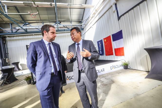 Le président de DAS Solar,Yong Liu (à droite),présente l’implantation de la future gigafactory photovoltaïque à Rémi Bastille,le préfet du Doubs,à Mandeure,le 11 avril 2025. LIONEL VADAM/« L'EST REPUBLICAIN »/MAXPPP Quatorze usines de fabrication de panneaux solaires photovoltaïques,avec quelque 8 900 salariés : voilà le profil dont se prévaut DAS Solar en République populaire de Chine. Fondé en 2018,le groupe privé chinois projette aujourd’hui d’inaugurer une usine en Europe,dans la commune de Mandeure (Doubs),où il a racheté aux pouvoirs publics,en novembre 2024,une friche de près de 100 000 mètres carrés délaissée par l’équipementier automobile Forvia (ex-Faurecia),non loin de la frontière suisse et de l’Allemagne.