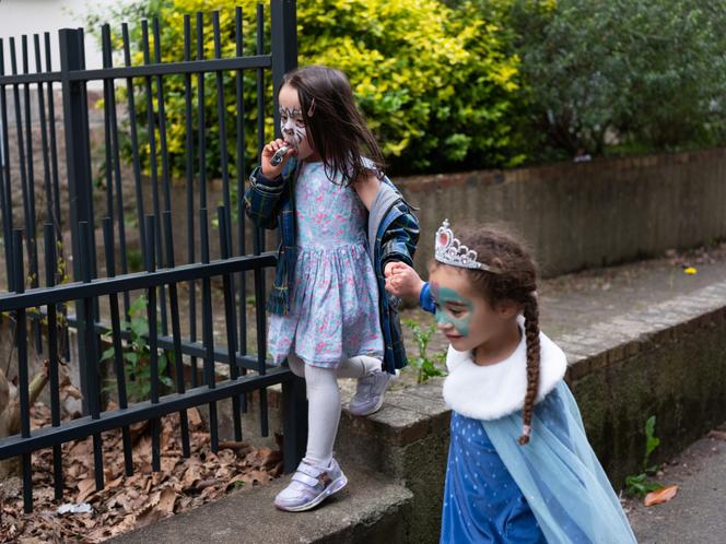 Toute la bande part défiler dans les rues de ce quartier résidentiel,au son d’une enceinte portative crachant Le Papa pingouin. Marin,atteint d’un trouble du spectre autistique (TSA),a enfilé un casque antibruit pour mieux supporter les cris d’enfants excités. Derrière lui,Thaïs,6 ans,assise dans une poussette,observe calmement l’agitation autour d’elle. Sa grande sœur Apolline,9 ans,déguisée en Jedi,marche à côté d’elle,lui tenant consciencieusement la main. « Ça fait plaisir d’être avec ma sœur,quand j’ai pas de copains,je peux jouer avec elle,dit l’aînée,sabre laser à la main. On fait du toboggan,c’est son activité préférée. Mais je me suis aussi fait d’autres copains,parce que des fois elle aime bien être seule. »