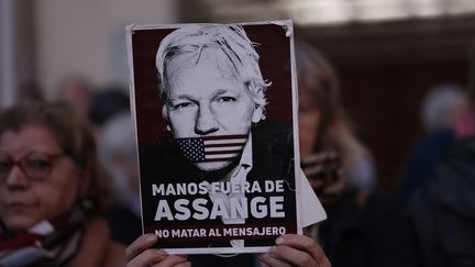Julian Assange bénéficie de soutiens dans le monde entier. Ici,un manifestant à Madrid brandit le 20 février 2024 une pancarte devant l'ambassade américaine : "On ne tue pas le messager". (THOMAS COEX / AFP)
