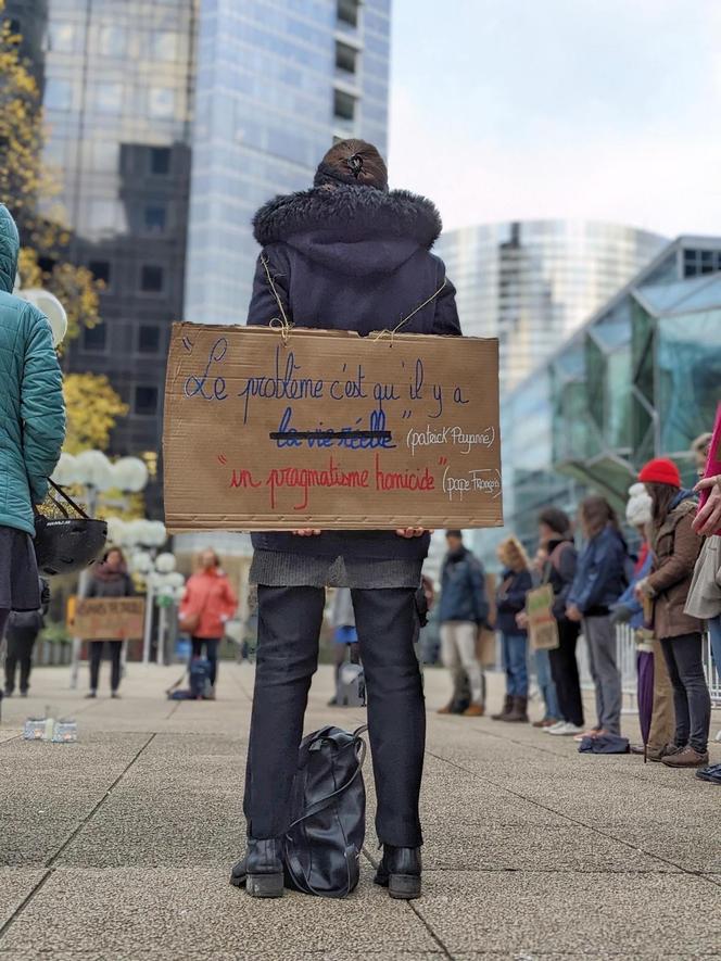 Lors d’une manifestation silencieuse devant la tour TotalEnergies,à Paris, le 7 novembre 2023. CLAIRE RIOBÉ Paris,avril 2023. Deux kilomètres après la brasserie La Rotonde en feu et un black bloc bataillant avec les forces de l’ordre,une poignée de jeunes militants déploient des tabourets devant un Abribus. Quelques minutes plus tard,les premiers manifestants arrivent à Denfert-Rochereau. Assis sur la chaussée,les membres d’Anastasis,groupe de jeunes chrétiens opposés à l’économie de marché autant qu’à une interprétation identitaire de la foi,leur cirent les chaussures.