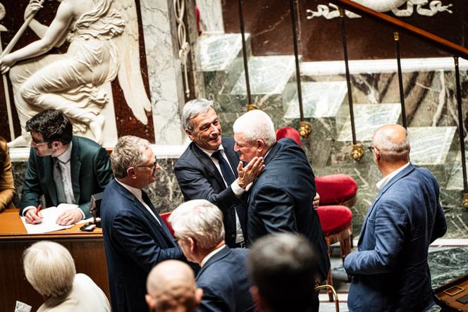 Le député MoDem Philippe Vigier salue le rapporteur général,Olivier Falorni,à l’issue du vote sur la proposition de loi relative au droit à l’aide à mourir,à l’Assemblée nationale,le 27 mai 2025. JULIEN MUGUET POUR « LE MONDE » Généralement,les votes à l’Assemblée nationale s’accompagnent d’un brouhaha ambiant. Les chefs de file crient les consignes de vote pendant que certains députés s’empressent de regagner leur siège à la va-vite. Mais,ce mardi 27 mai,le vote solennel sur la fin de vie n’était pas un vote comme les autres.