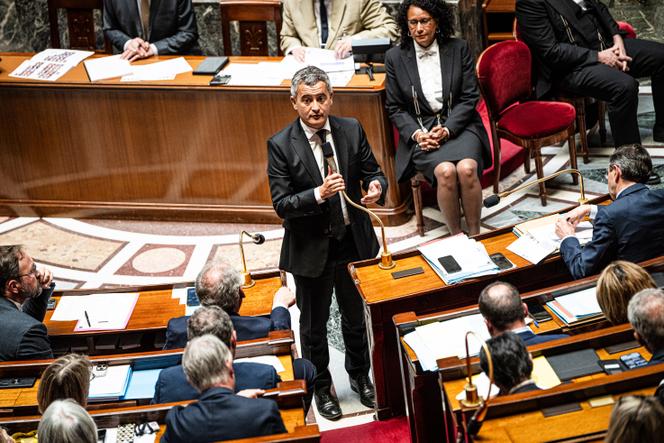 Le ministre de la justice,Gérald Darmanin,à l’Assemblée nationale,à Paris,le 27 mai 2025. JULIEN MUGUET POUR « LE MONDE » Un tweet le matin et un 20 heures le soir. Entre les deux,le premier ministre qui reprend devant l’Assemblée nationale sa principale proposition. Voilà une journée rondement menée pour Gérald Darmanin. Mardi 3 juin au matin,au lendemain des premières comparutions immédiates des auteurs de violences commises dans Paris,à l’occasion de la célébration de la victoire du PSG,le garde des sceaux a réagi sur X : « Une partie des condamnations pour violences,notamment commises à l’encontre des forces de l’ordre et pour destructions de biens,ne sont plus à la hauteur de la violence que connaît notre pays »,écrit-il. Quatre personnes d’une vingtaine d’années ont été condamnées à des peines de deux à huit mois d’emprisonnement avec sursis,assorties de 500 euros d’amende.